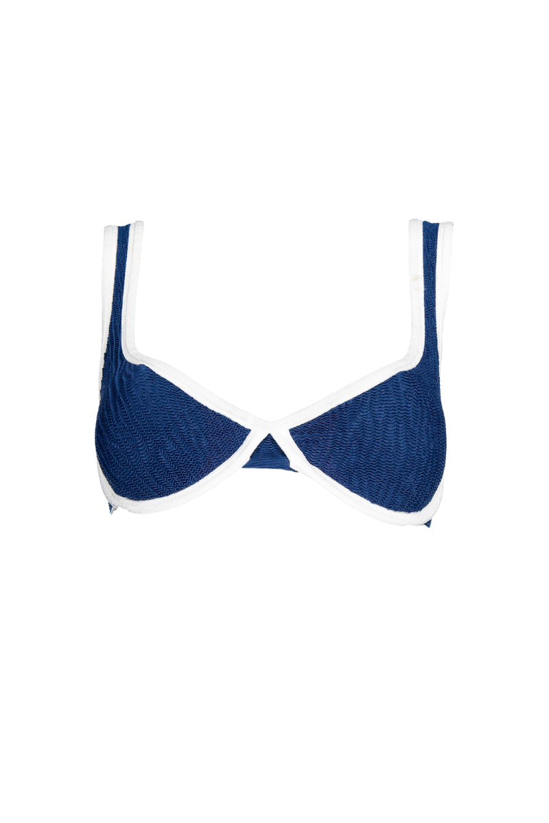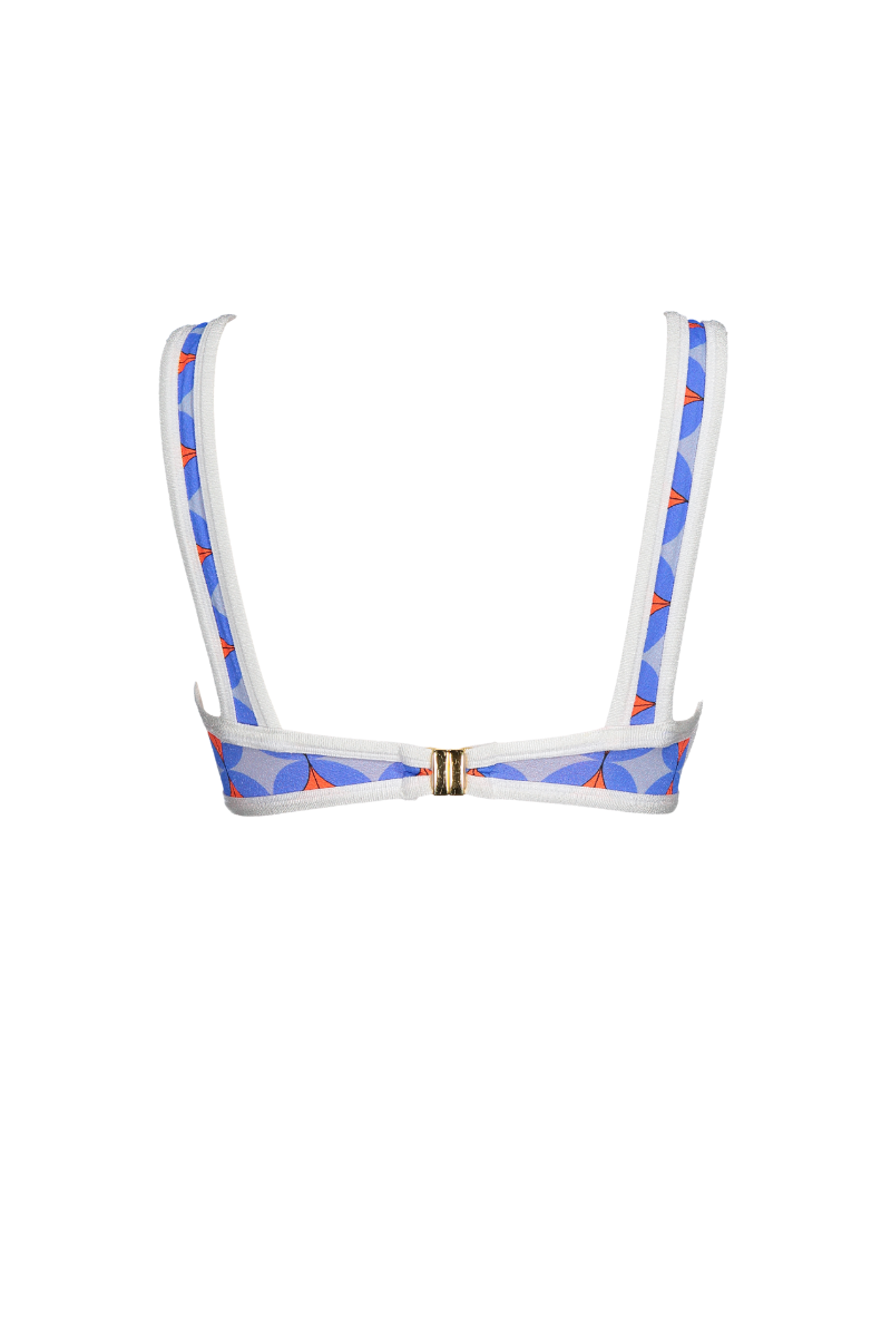 Top com decote balconette, aros e alças largas. Aperta com fecho em metal dourado nas costas. Medida de costas e alças não ajustáveis. Acabamento em viés à volta do top. Com abertura para copas amovíveis.