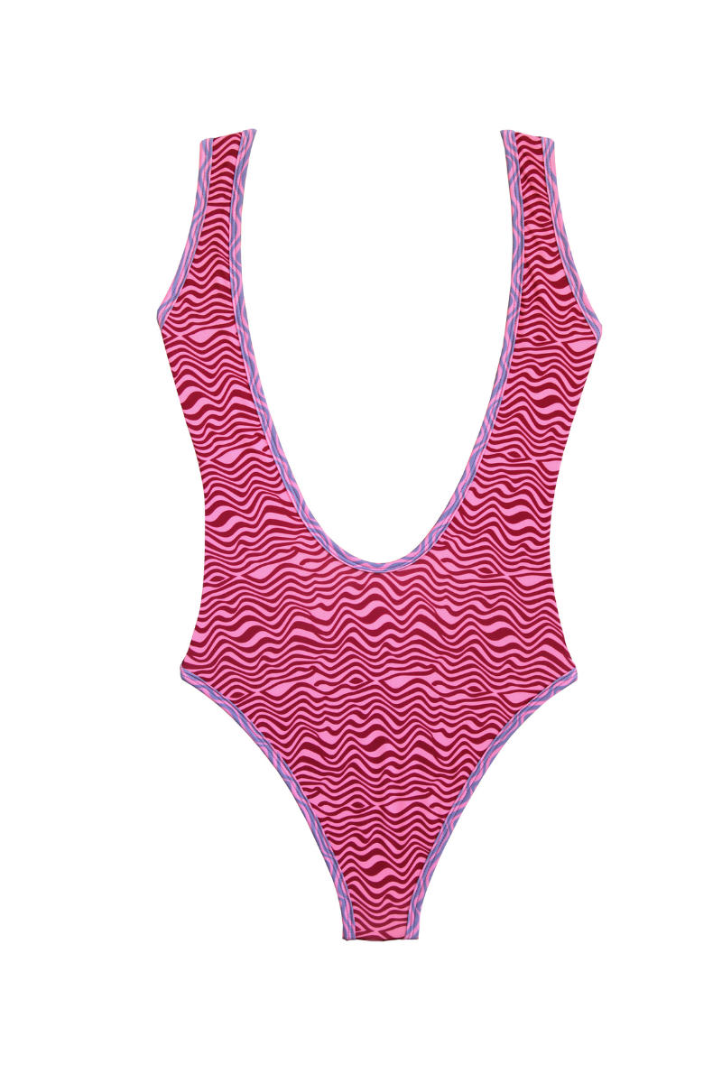 Fato-de-banho com corte simples tipo “baywatch”, decote em barco e abertura grande nas costas para um bronzeado perfeito. Pormenor de viés com cor contraste a toda a volta. Não tem enchimento.