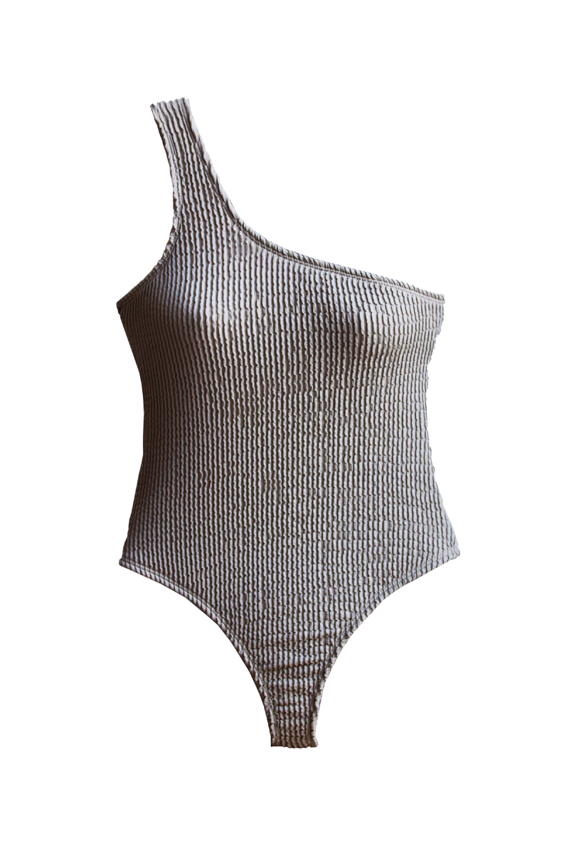 Fato-de-banho assimétrico com alça única larga e diagonal nas costas. Decote bandeau e corte normal.