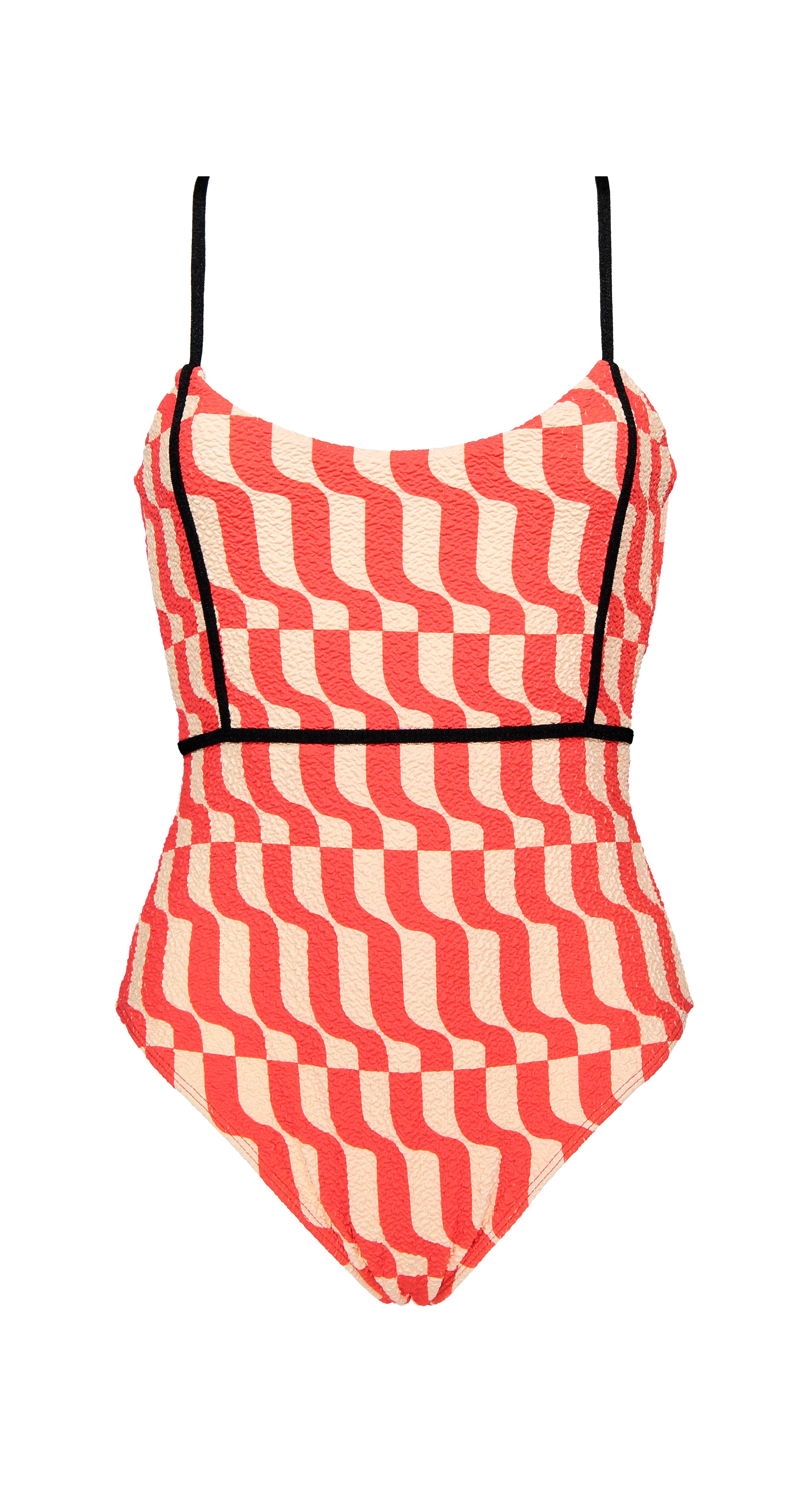 Fato-de-banho com corte subido na parte frontal. Costas abertas com alças feitas em correntes de tecido que cruzam a meio das costas.