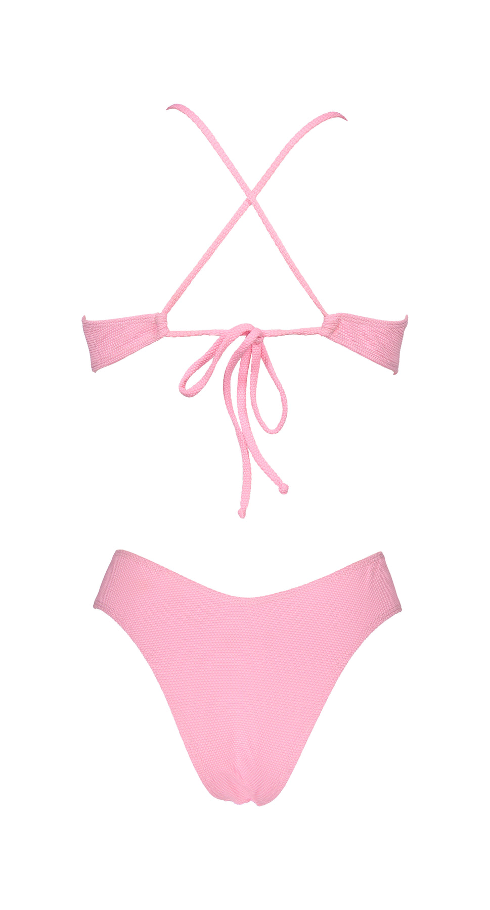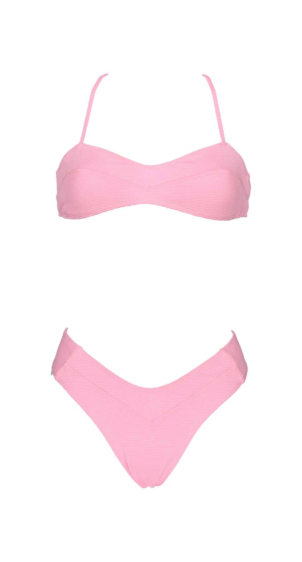 Top with classic triangle design and removable bows. It closes at the back with a bow and adjustable straps. No rims. With opening for removable cups.
