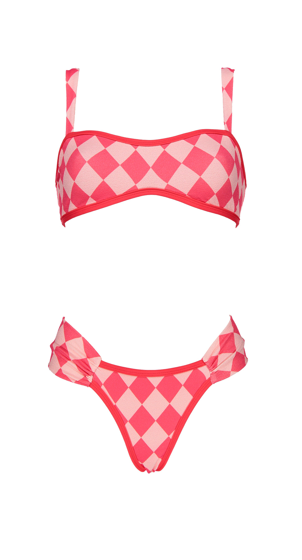 Balconette top with bias binding around the edge and gold fastening at the back. Thin, non-adjustable straps. With opening for cups.
