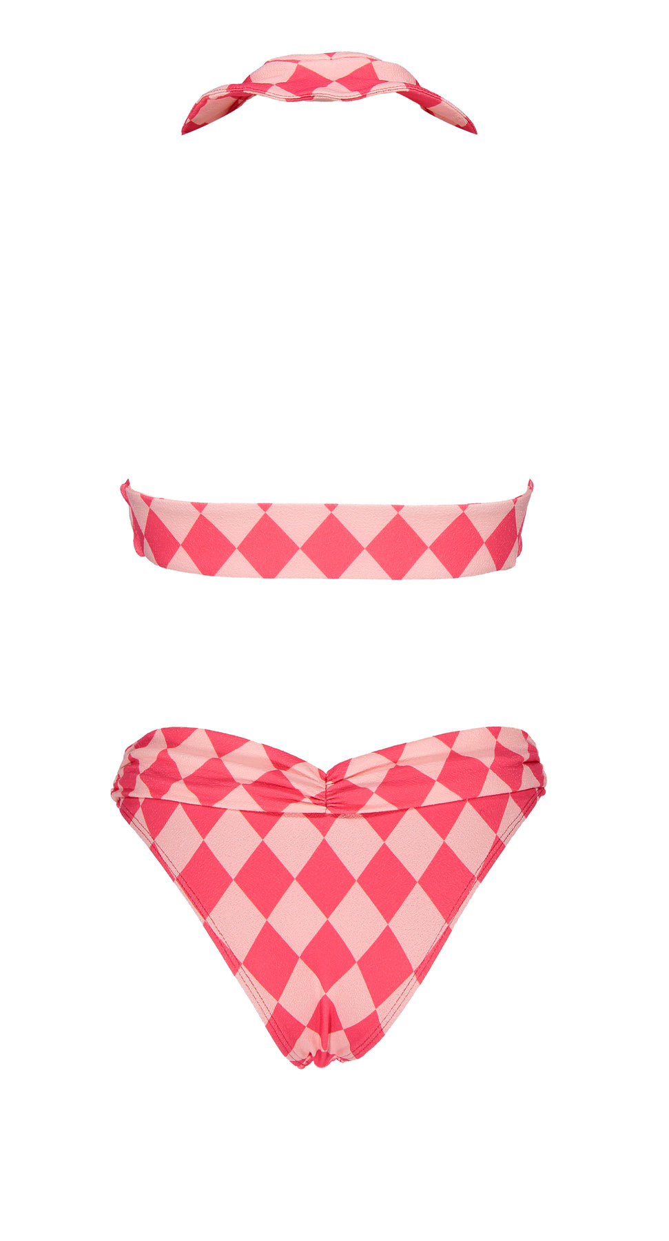 Balconette-style top, non-adjustable, with thick elastic at the back for greater comfort. Non-adjustable collar-style straps, which you simply pull over your head. With opening for cups.