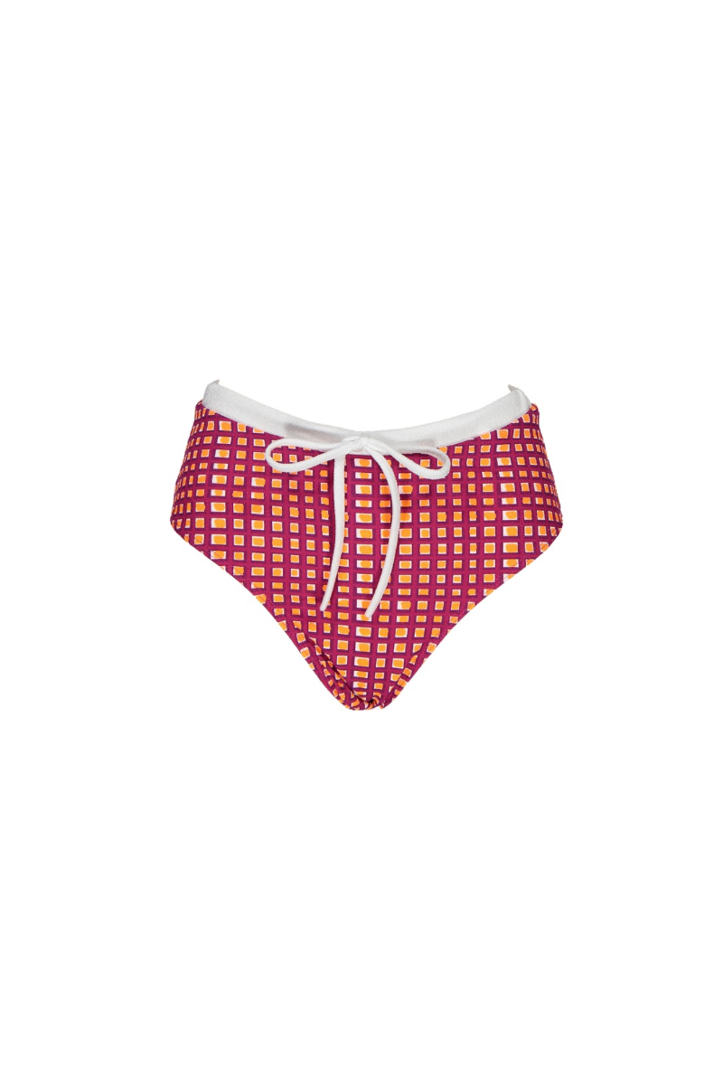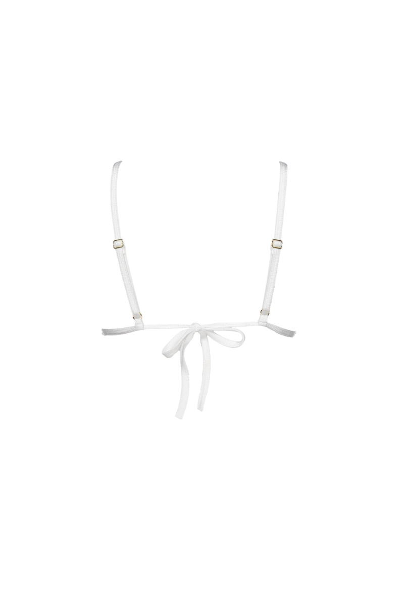 Triangle-shaped top with a ‘curtain’ chest base allowing you to adjust the cup size to your bust size. With contrasting fabric trim around the edge. Fastens at the back with a tie or can be wrapped around the waist several times. Adjustable straps with sliders. Includes opening for cups. No underwire.