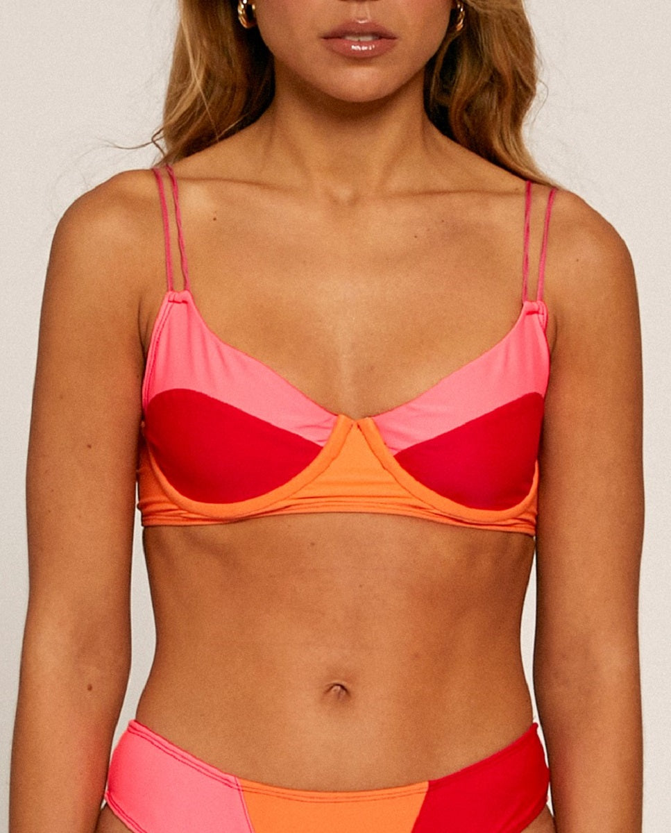 Top com decote balconette, aros e alças duplas extra finas. Medida de costas e alças não ajustáveis.