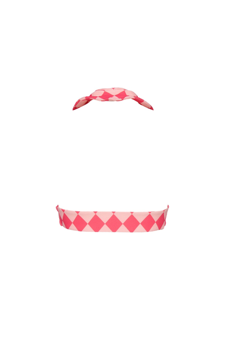 Balconette-style top, non-adjustable, with thick elastic at the back for greater comfort. Non-adjustable collar-style straps, which you simply pull over your head. With opening for cups.