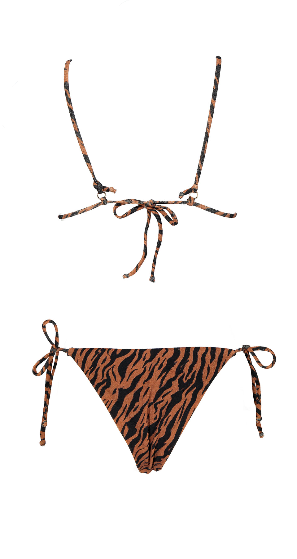 Top com formato triangular, com base de peito "cortina" permitindo ajustar o tamanho da copa ao tamanho do peito. Aperta atrás com laço ou pode dar a voltas à barriga. Sem aros. Com abertura para copas amovíveis.