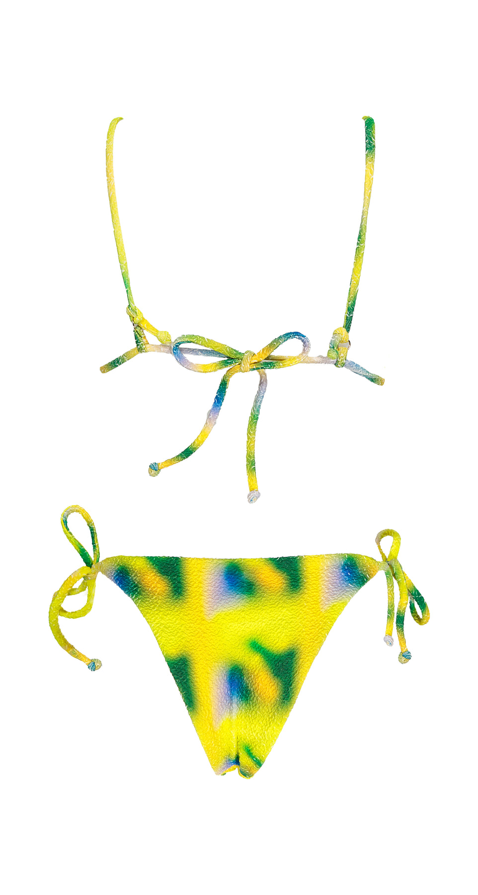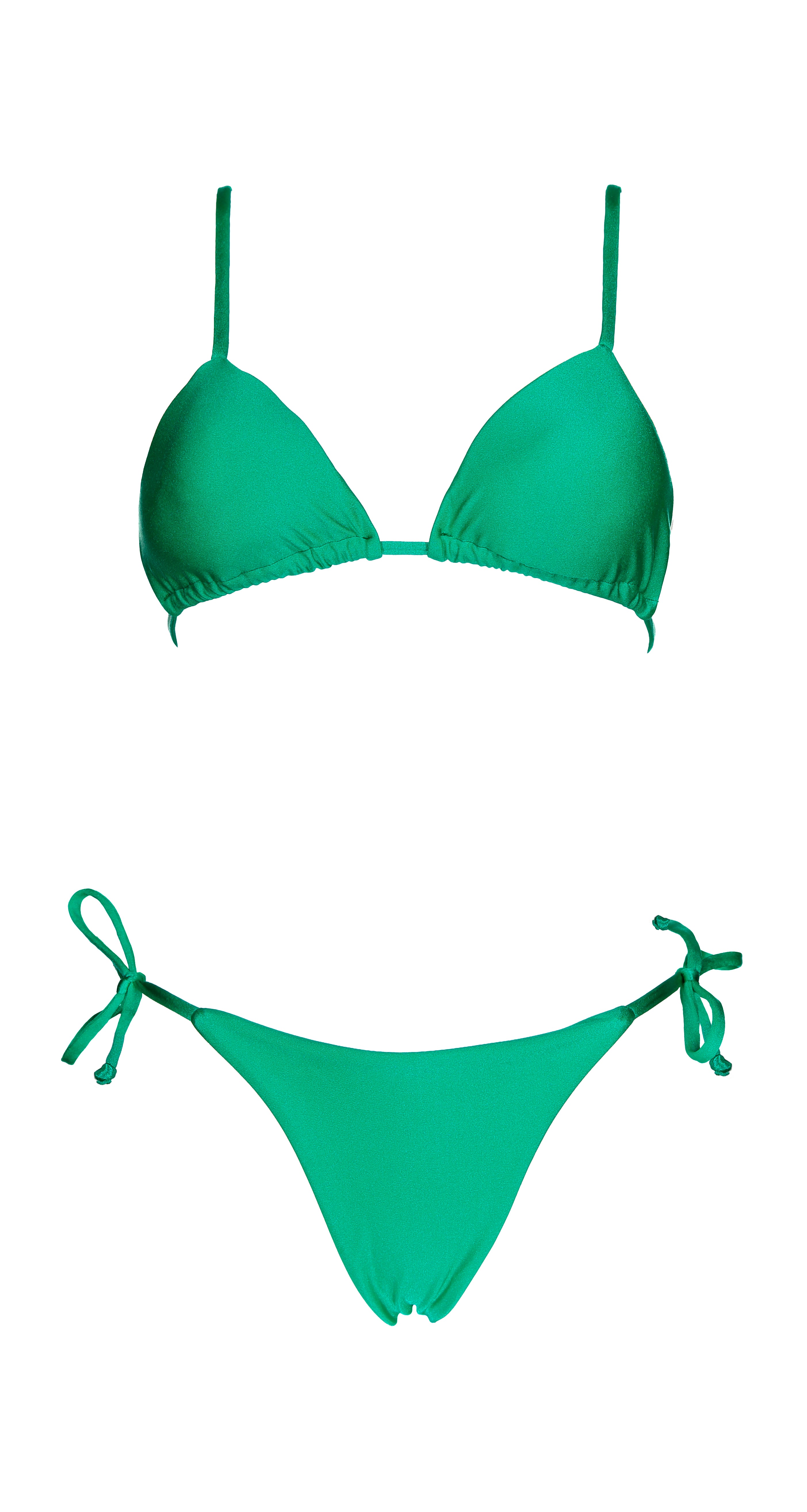 Top com formato triangular, com base de peito "cortina" permitindo ajustar o tamanho da copa ao tamanho do peito. Aperta atrás com laço ou pode dar a voltas à barriga. Sem aros. Com abertura para copas amovíveis.
