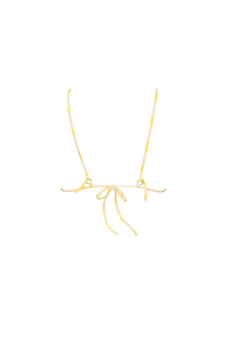 Top com formato triangular, com base de peito "cortina" permitindo ajustar o tamanho da copa ao tamanho do peito. Aperta atrás com laço ou pode dar a voltas à barriga. Sem aros. Com abertura para copas amovíveis.