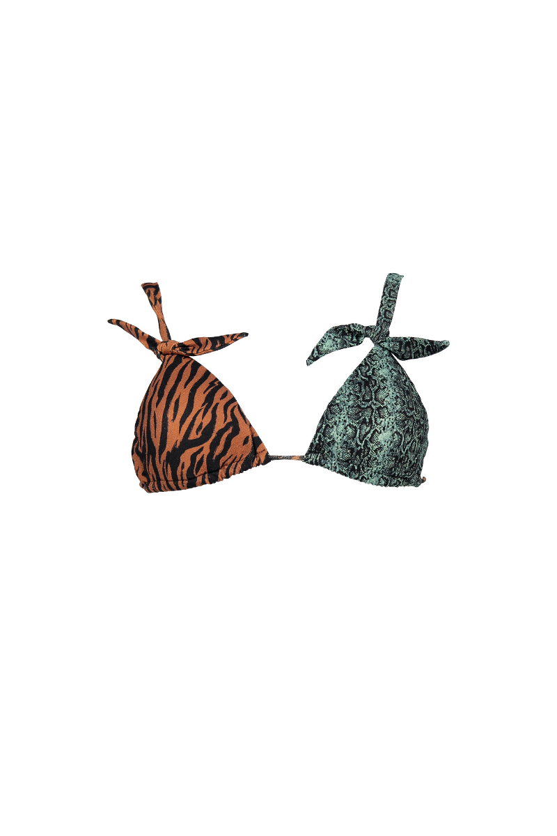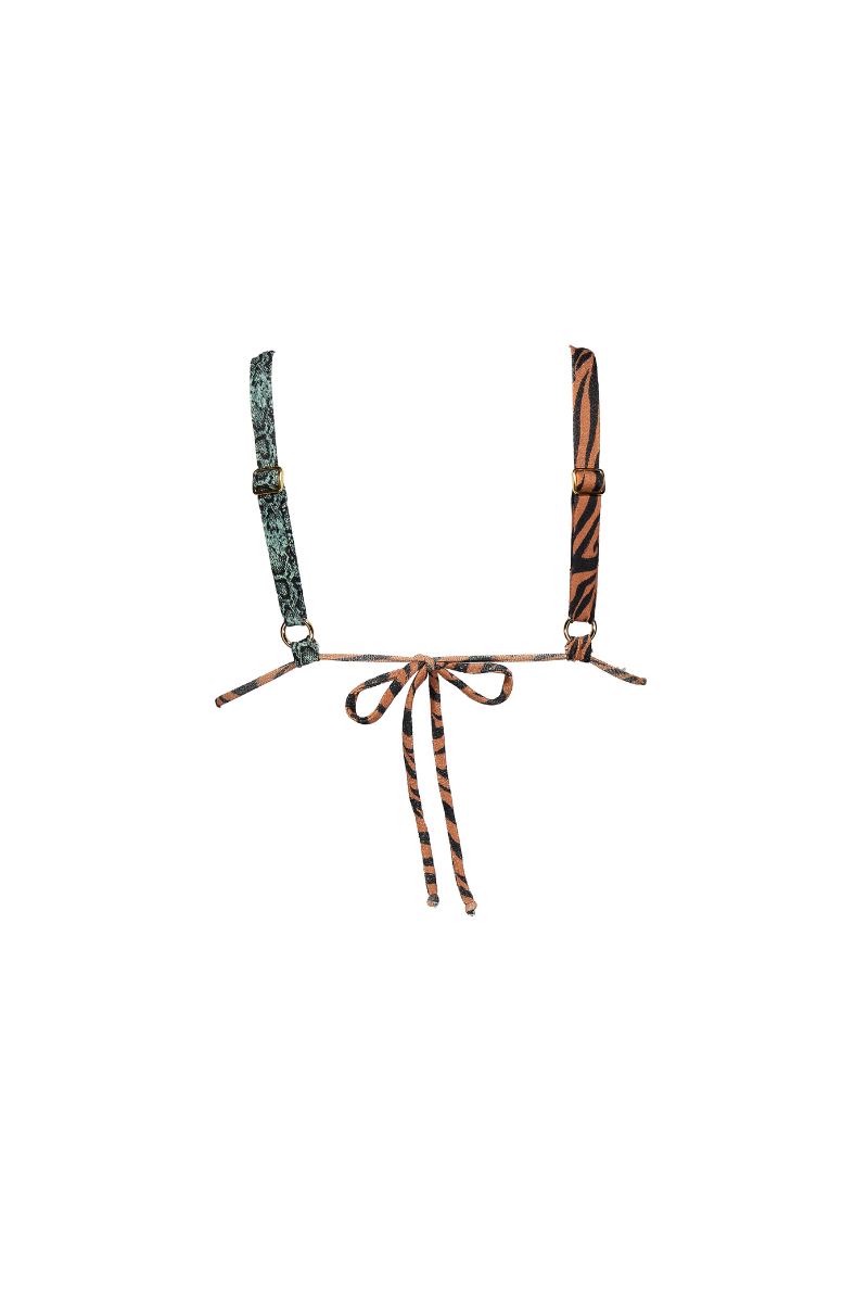Top com corte triângulo clássico e lacinhos amovíveis. Aperta nas costas com laço e alças com tamanho ajustável. Sem aros. Com abertura para copas amovíveis.
