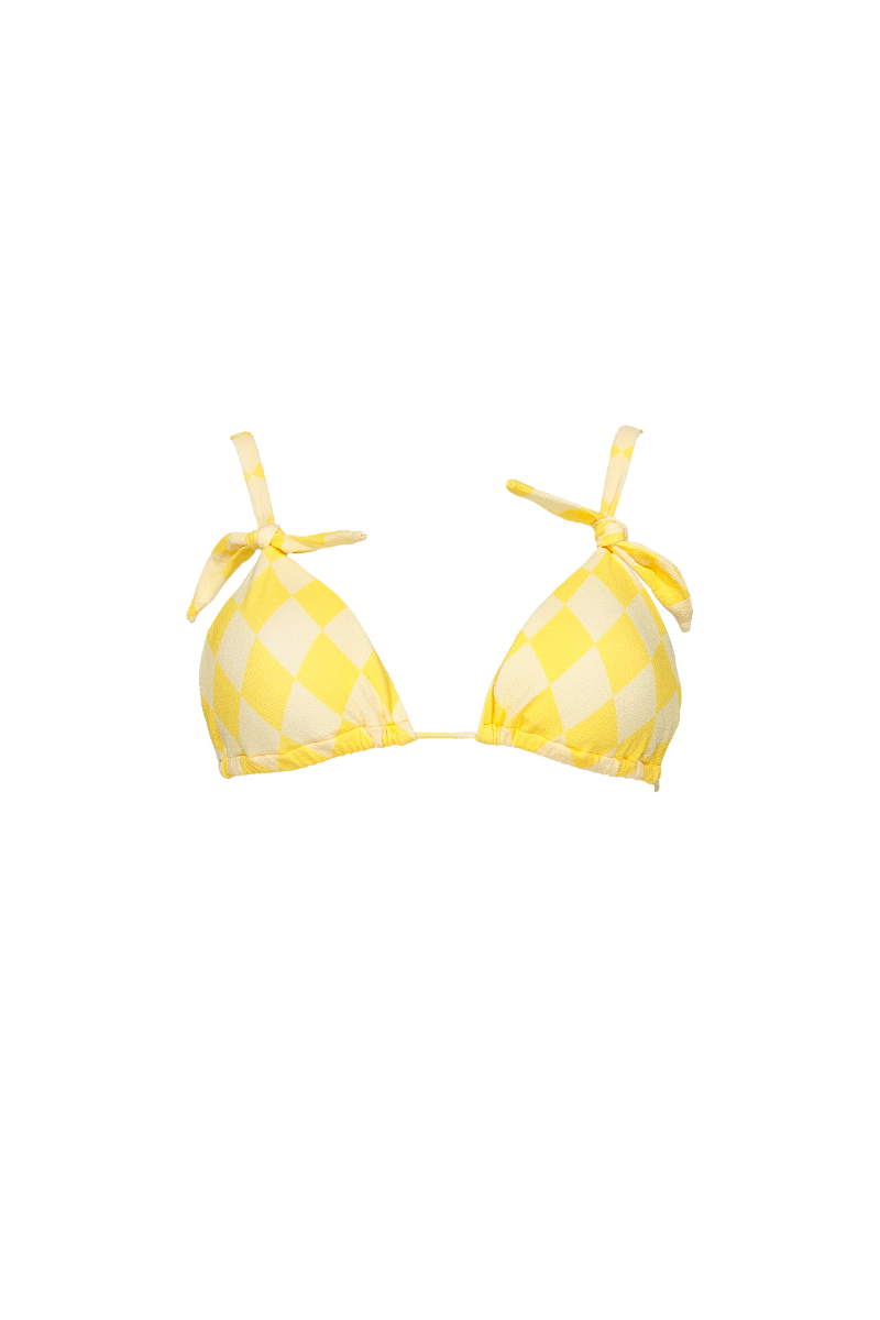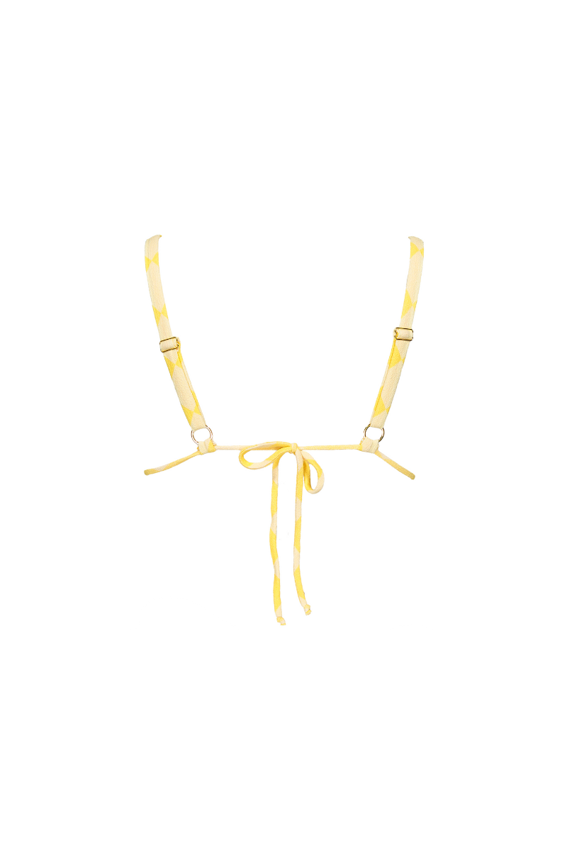 Top com corte triângulo clássico e lacinhos amovíveis. Aperta nas costas com laço e alças com tamanho ajustável. Sem aros. Com abertura para copas amovíveis.