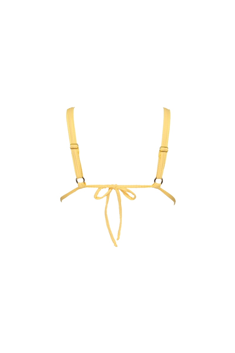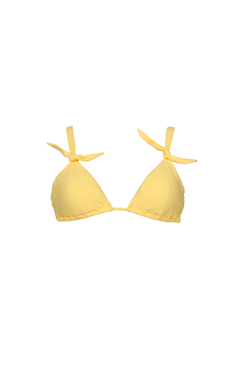 Top com corte triângulo clássico e lacinhos amovíveis. Aperta nas costas com laço e alças com tamanho ajustável. Sem aros. Com abertura para copas amovíveis.