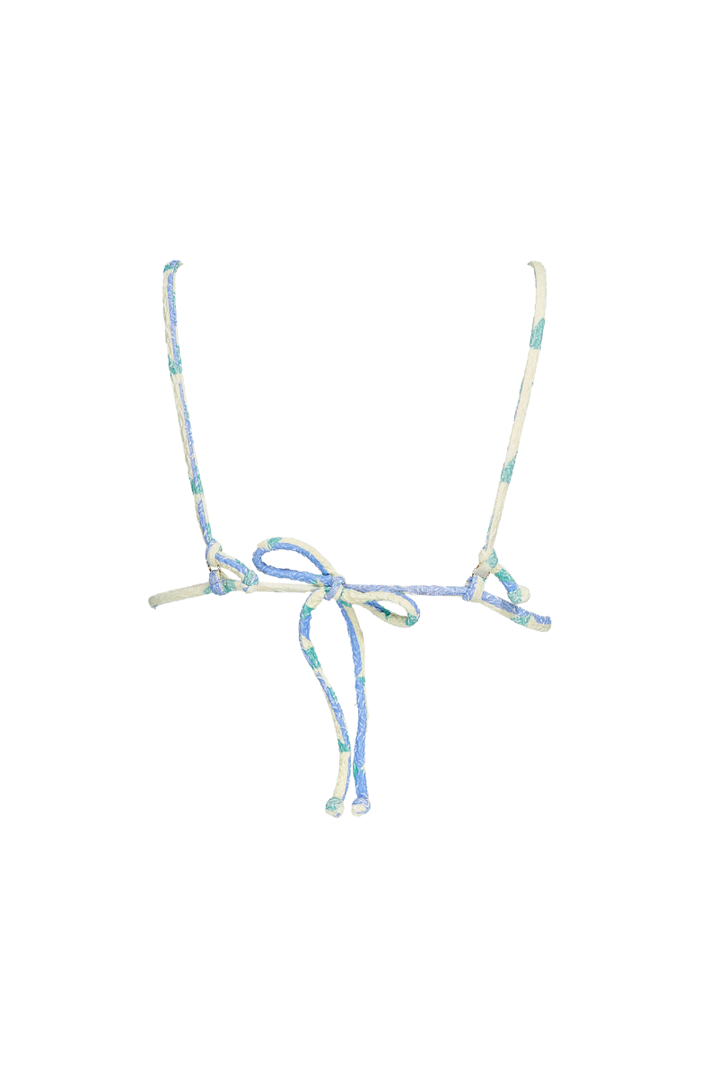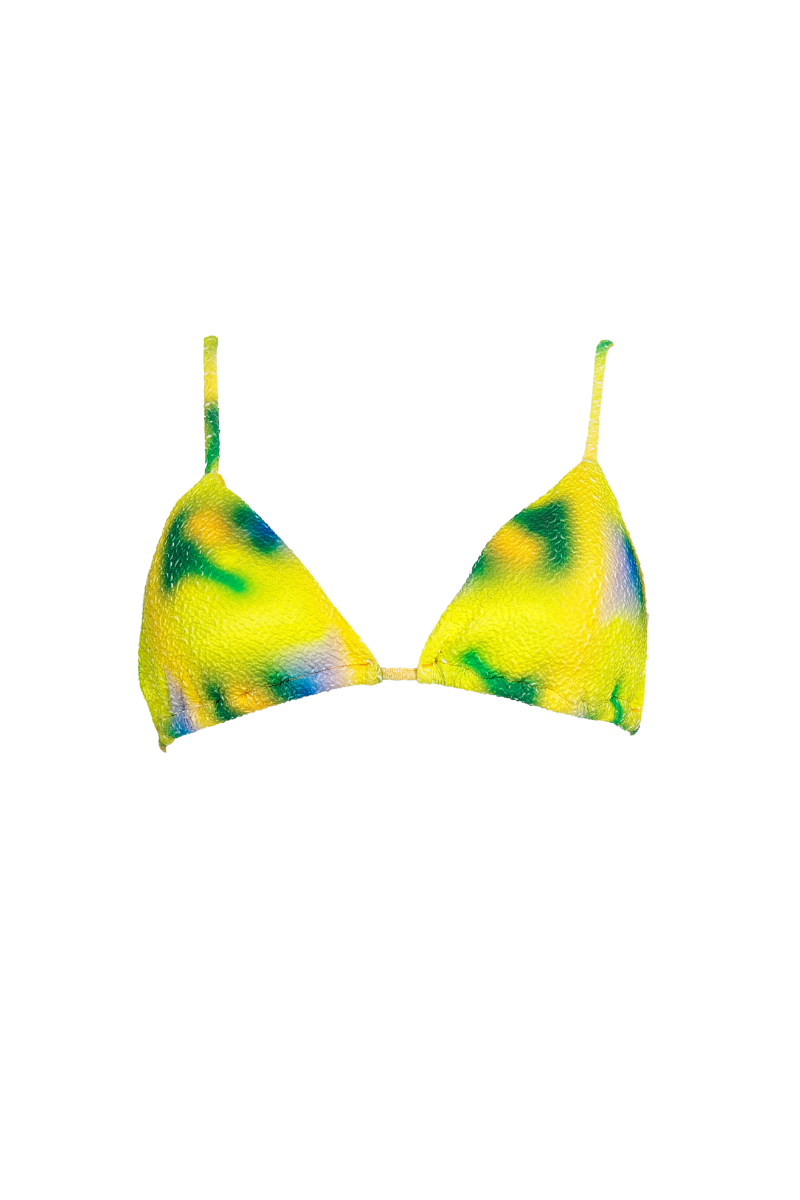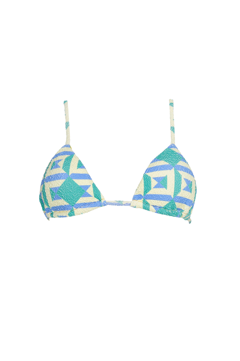 Top com formato triangular, com base de peito "cortina" permitindo ajustar o tamanho da copa ao tamanho do peito. Aperta atrás com laço ou pode dar a voltas à barriga. Sem aros. Com abertura para copas amovíveis.