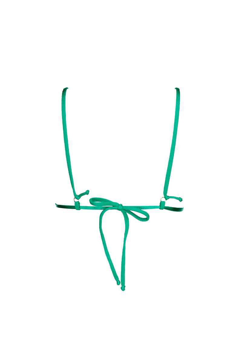 Top com formato triangular, com base de peito "cortina" permitindo ajustar o tamanho da copa ao tamanho do peito. Aperta atrás com laço ou pode dar a voltas à barriga. Sem aros. Com abertura para copas amovíveis.