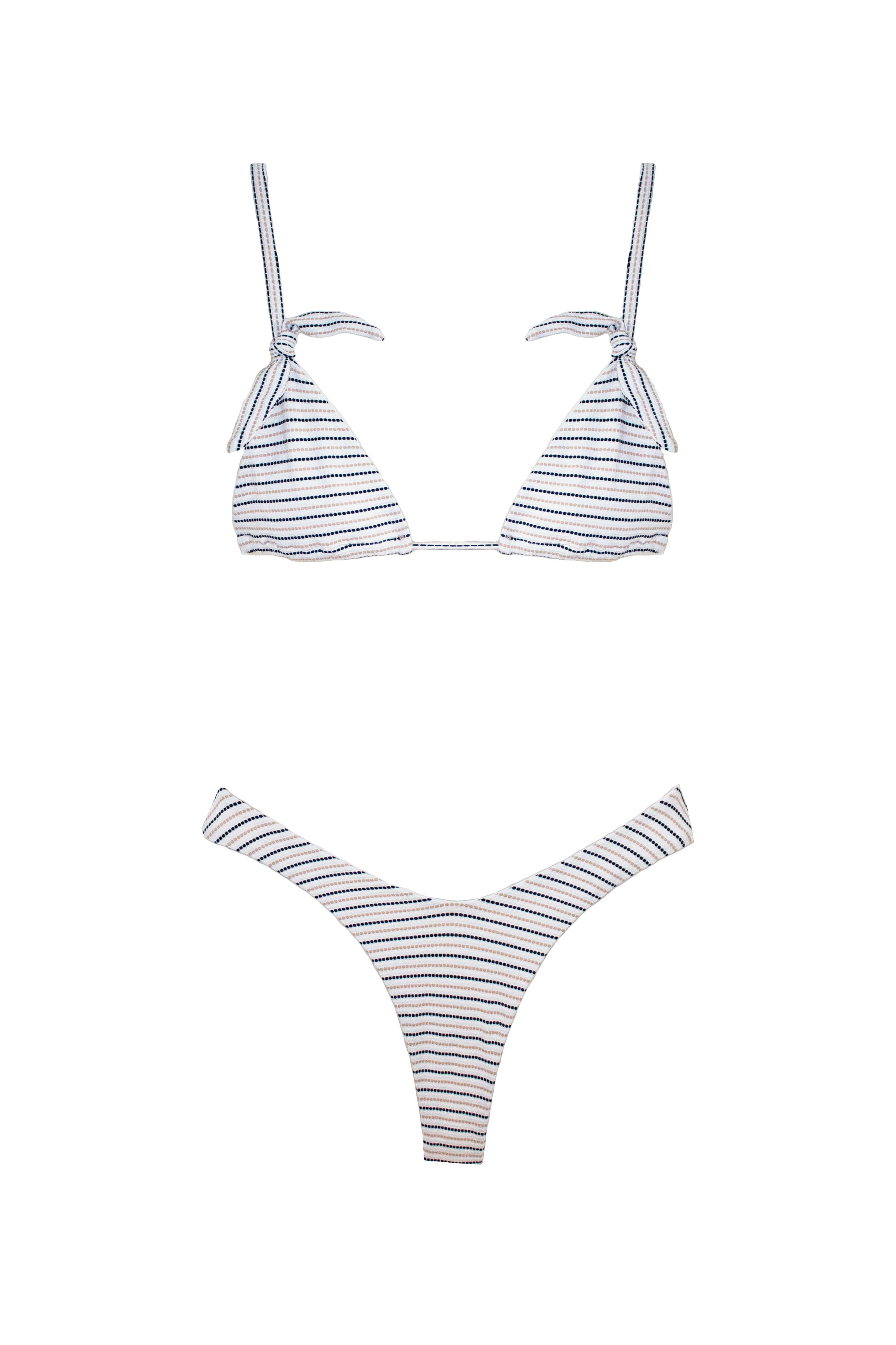Fato-de-banho com corte subido na parte frontal. Costas com alças feitas em correntes de tecido que cruzam a meio das costas. Sem aros e sem copas.